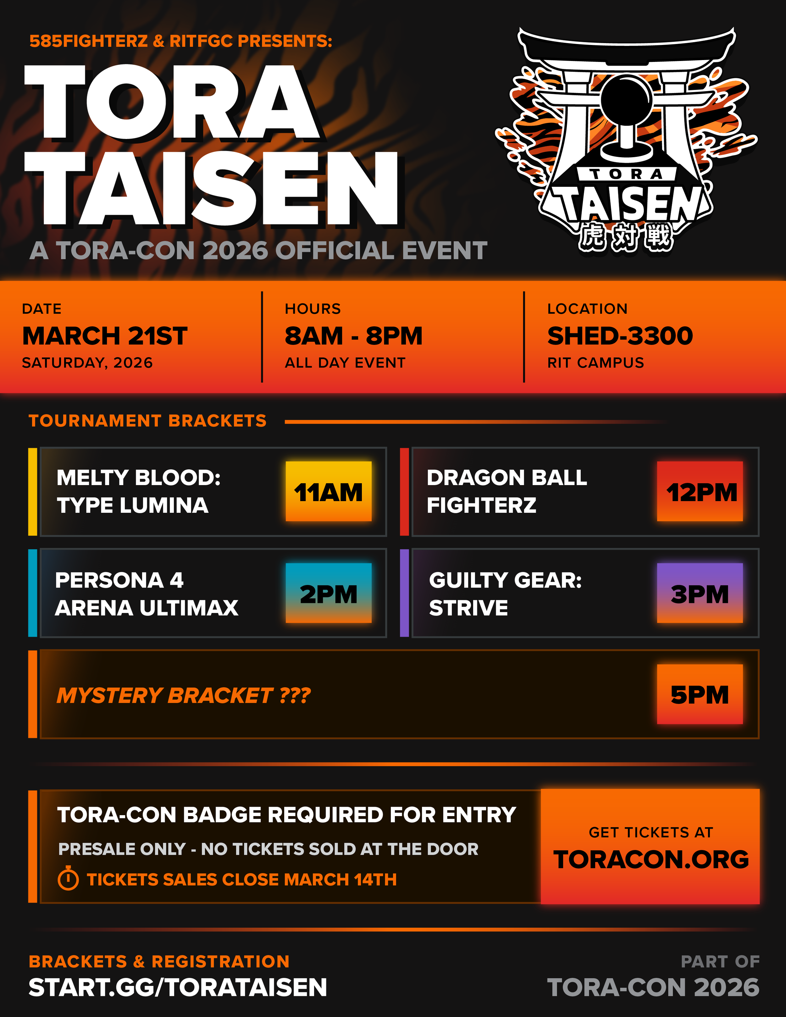 RIT FGC plans on running four brackets on the Saturday of Tora-Con: Guilty Gear Strive, Melty Blood Type Lumina, Street Fighter 6, and Dragon Ball FighterZ. These will be casual brackets that anyone can enter, along with the four brackets friendly matches for various other fighting games will happening on the side. We hope that you stop by to play during Tora-Con.